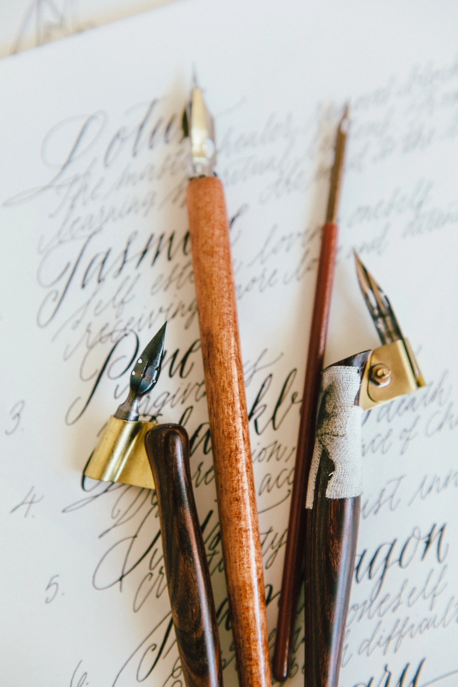 After looking at other interviews it seems I’m pretty simple as far as my calligraphy supplies go. My top favorite and indispensable calligraphy supply is a tiny box of vintage R. Esterbrook nibs I found at Addison Endpapers in Berkeley. I never heard of the nib before but wanted to try it. So glad I did! The nib is perfect for me, not too flexible and not too stiff, just right. As far as brushes and pencils, no particular brand, they just need to be sharp.